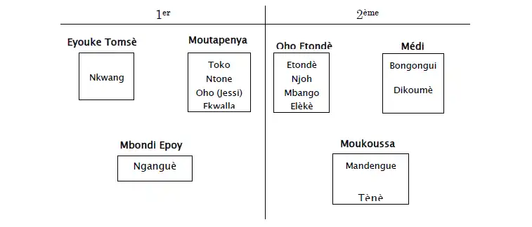Conformément à la tradition duala, ces épouses sont réparties dans deux foyers ayant chacun une marraine appelée ‘‘Nyango’a mboa’’ pour le premier et ‘‘ndongo’a muto’’ pour le deuxième, tel qu’il ressort du tableau ci-dessous