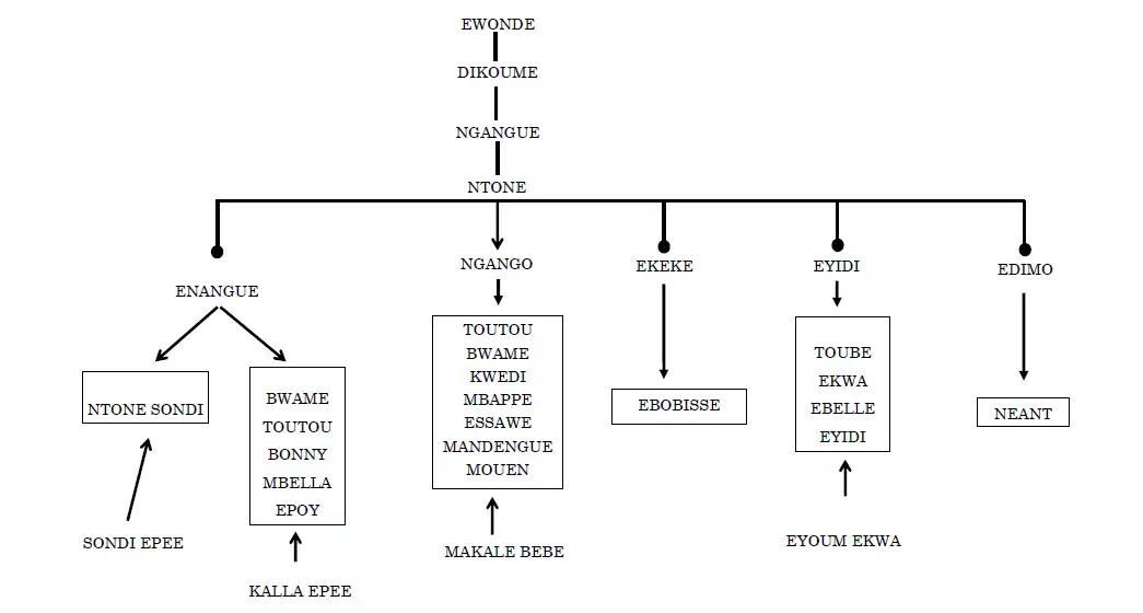 - Enanguè Ntonè : mariée à Sondi Epée, elle eut un enfant appelé Ntonè Sondi Epée. Enanguè Ntonè se remaria ensuite à Kalla Epée avec lequel elle eut la fratrie suivante :